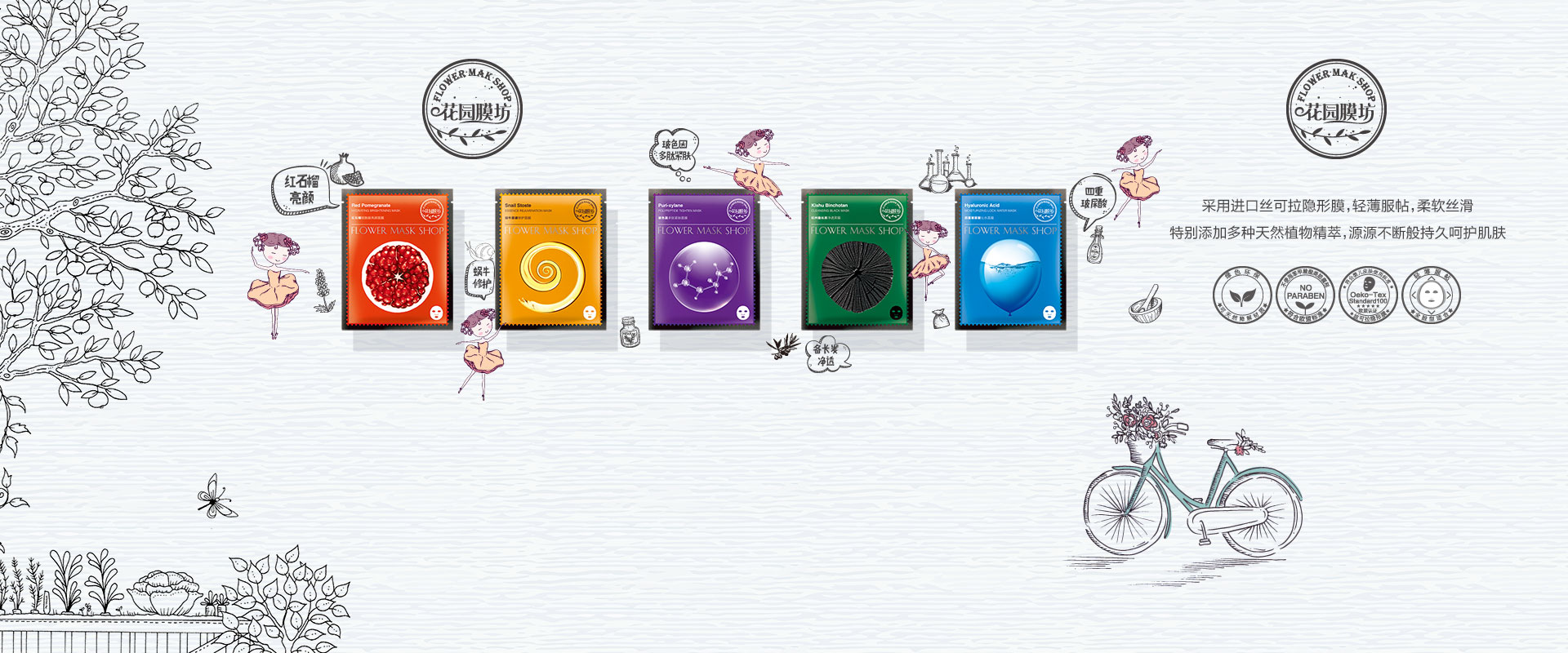 花园膜坊是致力于为肌肤带来纯粹感受的护肤艺术家,打造真正接近皮肤性质、安全温和、又拥有卓越效能的产品。进口医药级天然植物配方,进口婴幼儿级别及天然可降解膜材,不添加苯脂酸类防腐剂,高于国标的欧盟品质认证;以及让护肤有了时尚的灵魂的炫目个性的包装设计与过硬的内在品质完美结合,智慧与颜值并存,让人有一种用了一次就无法更换的欲望,是一片面膜,是一种心情,更是一种生活方式。